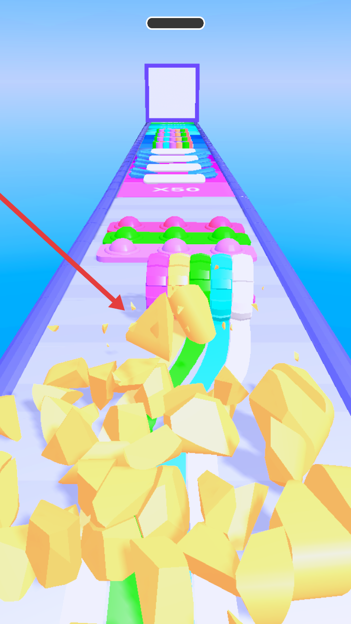 2、持续左右滑动,避开赛道上的各类障碍,同时击碎可破坏的物体,向关卡终点推进。