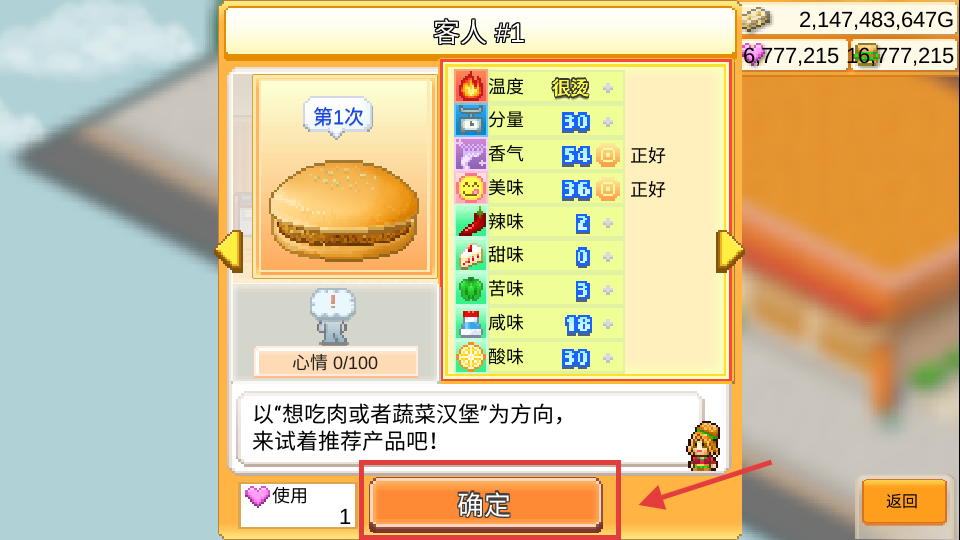 2、查看【客人#1】的口味需求,调整汉堡配方后点击【确定】,推荐产品提升客人心情。
