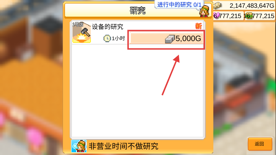 4、在研究界面支付【5,000G】,花费1小时进行【设备的研究】,解锁新设备提升产能。