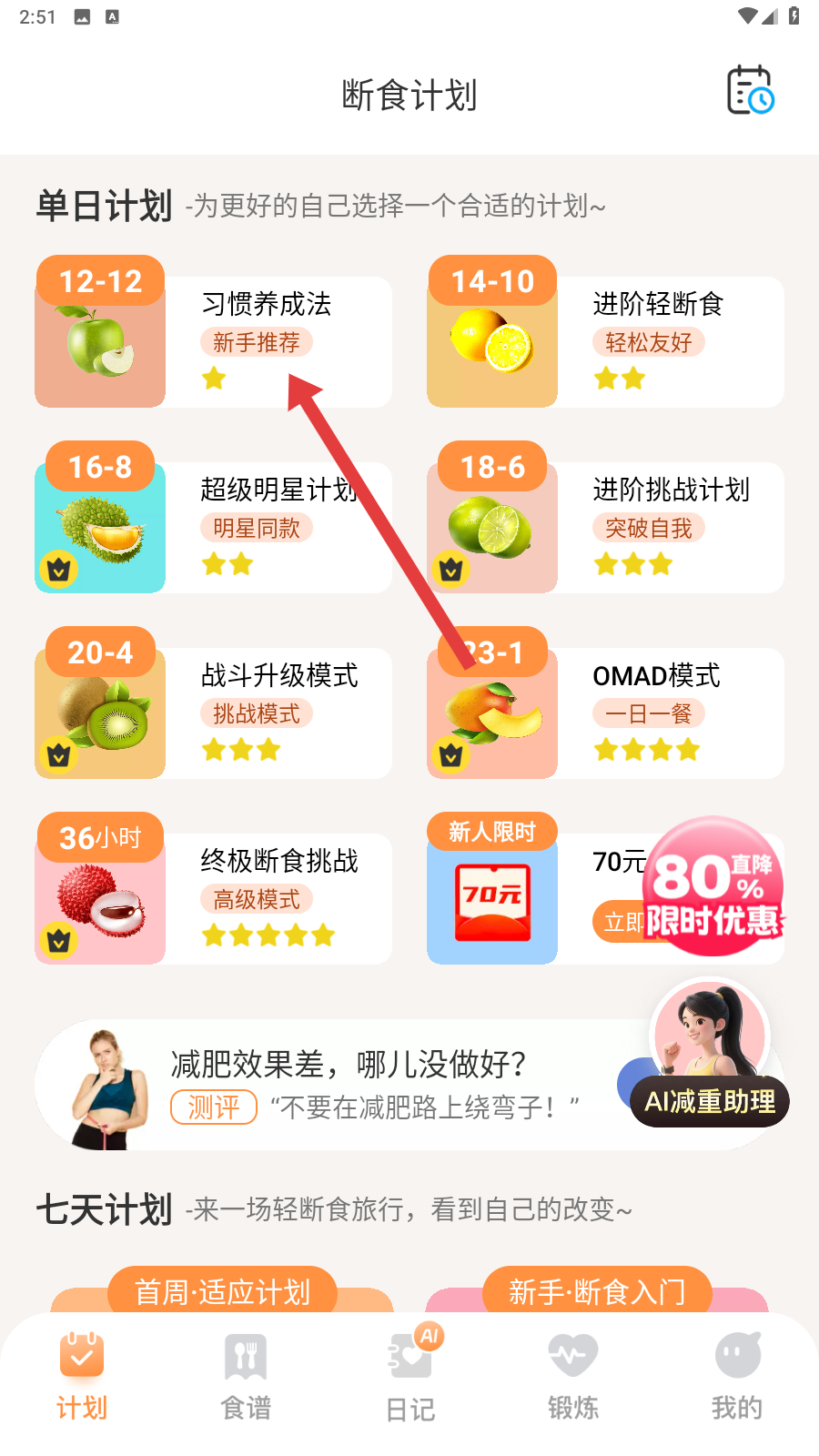 1、打开怪兽轻断食,在【断食计划-单日计划】中选择【习惯养成法-新手推荐】,这是适合新手的轻断食计划哦。
