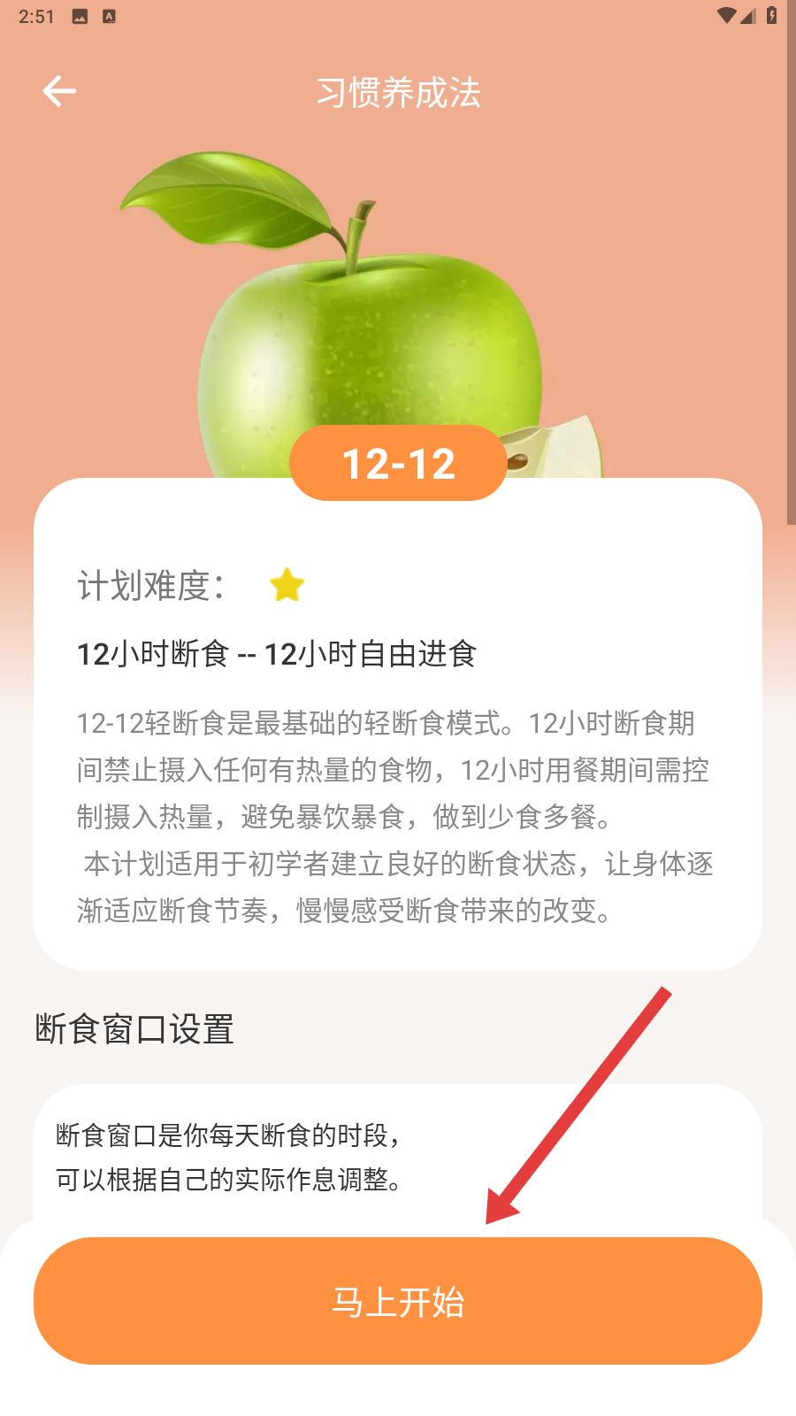 2、进入【习惯养成法】详情页,了解12-12断食模式后,点击【马上开始】,正式启动轻断食计划啦。