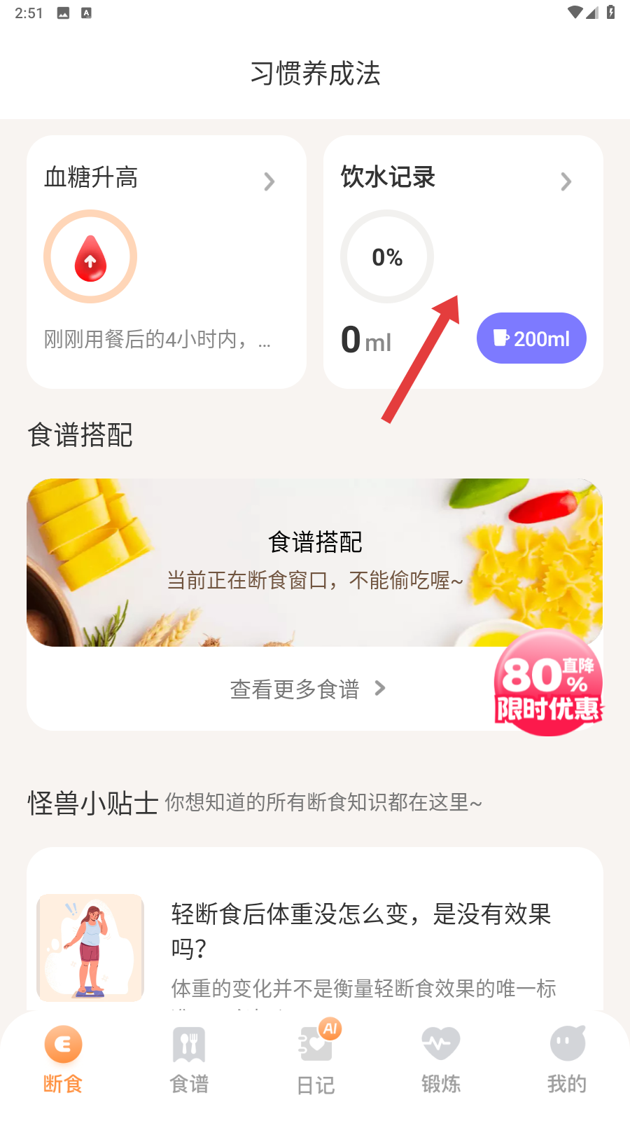 3、在断食界面,点击【饮水记录】可记录每日饮水量,还能查看食谱搭配和怪兽小贴士,助力科学断食呢。