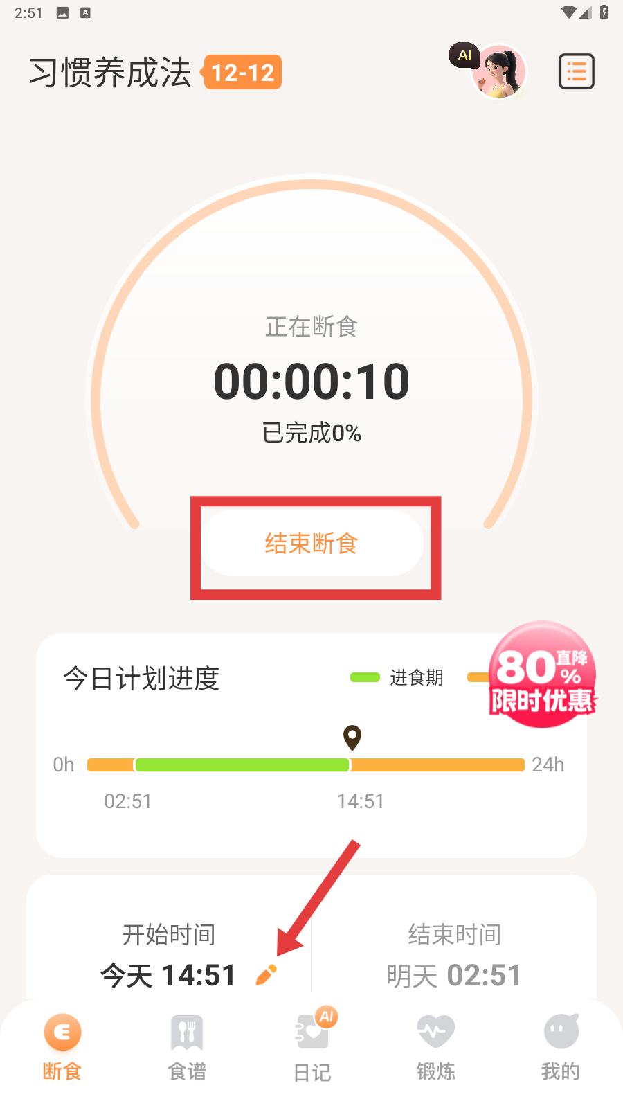 4、断食过程中,可点击【开始时间】旁的编辑图标调整时间,也能点击【结束断食】来完成当日的断食计划哦。