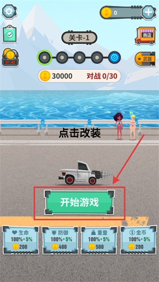 1、点击【开始游戏】进入关卡1,可先改装车辆提升生命、防御等属性,增强战力再闯关。