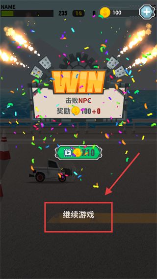 4、击败【NPC】后点击【继续游戏】,领取奖励金币,可用于升级车辆或解锁新武器,开启下一关挑战。
