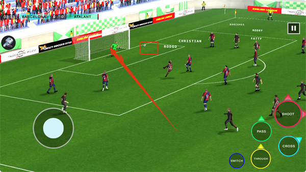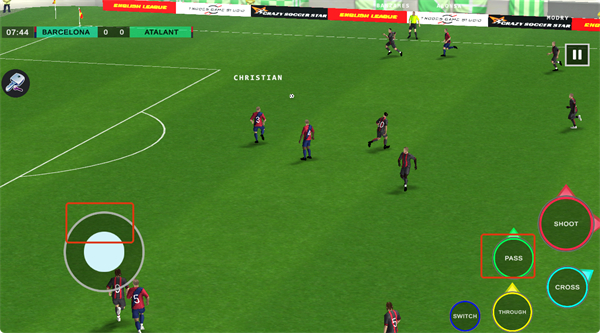 2、进入比赛后,通过左侧摇杆控制球员移动,利用右侧【SHOOT】【PASS】等按钮执行射门、传球操作,参与比赛进程。