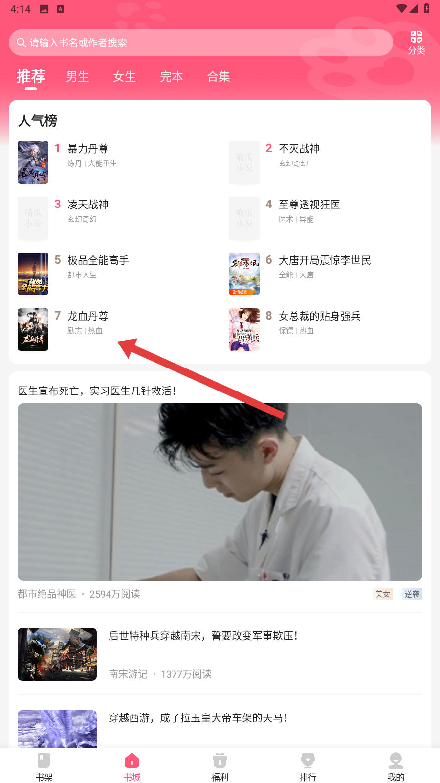 1、打开喵爪小说,我们可以在书城找到心仪小说,比如【龙血丹尊】,点击进入阅读页哦。