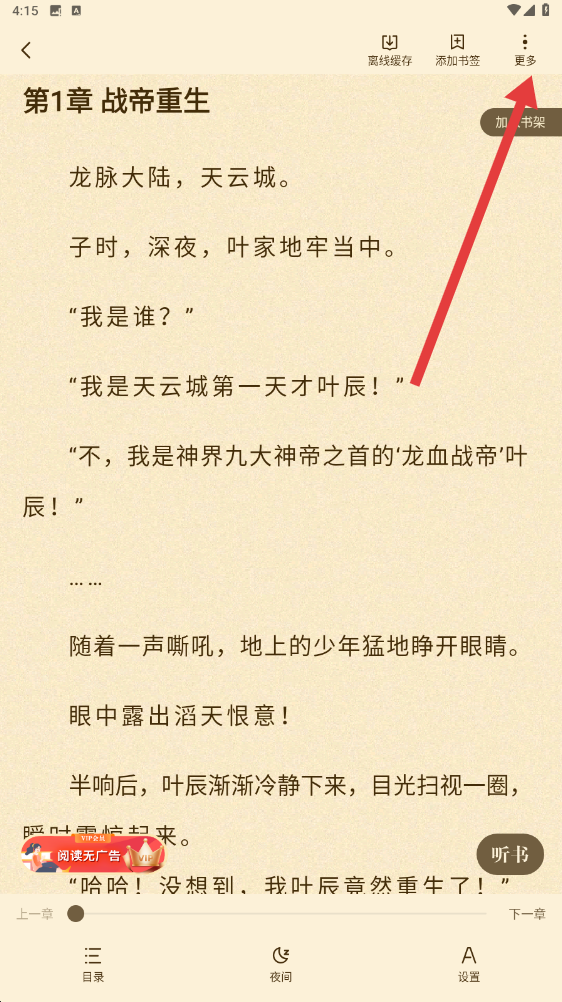 2、进入小说阅读页后,点击右上角【更多】按钮,展开功能选项呢。