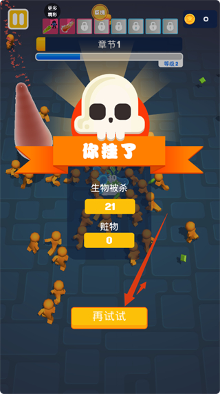 4、若游戏失败,界面显示【你挂了】,点击【再试试】可重新开始游戏,再次挑战【章节1】。