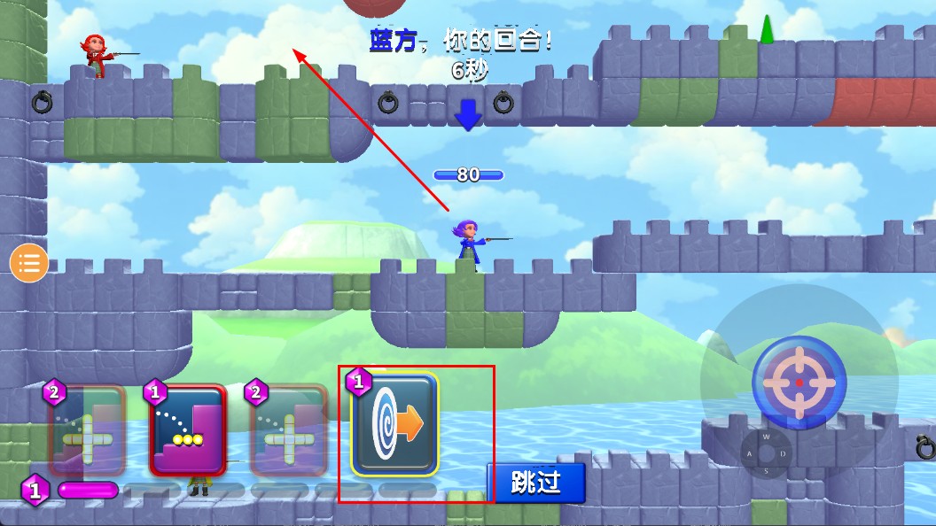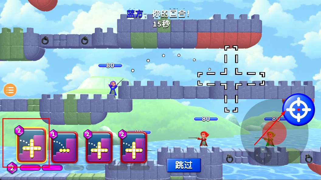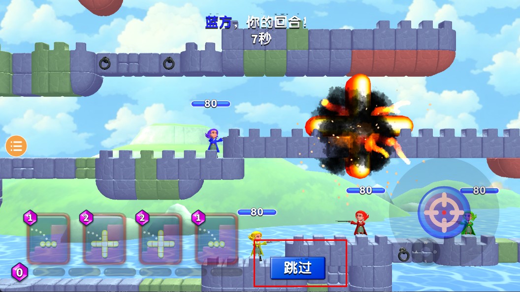 3、操控角色,点击瞄准按钮,向敌方区域发射技能,攻击敌人。