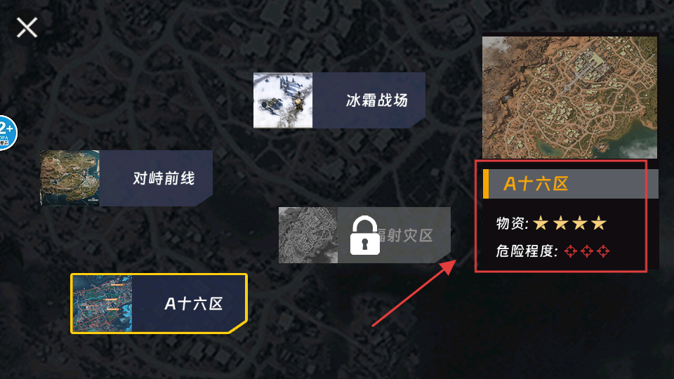 2、选择【A十六区】进入探索,该区域物资五星丰富但危险度高,需备好装备收集资源助力角色养成。