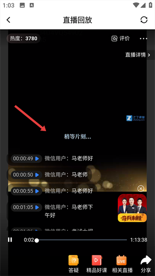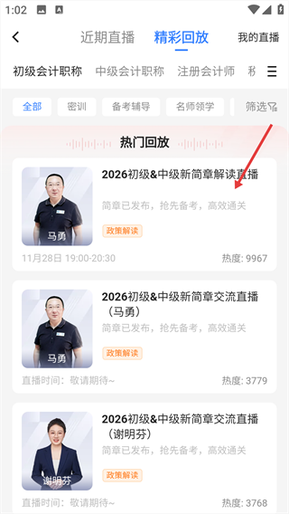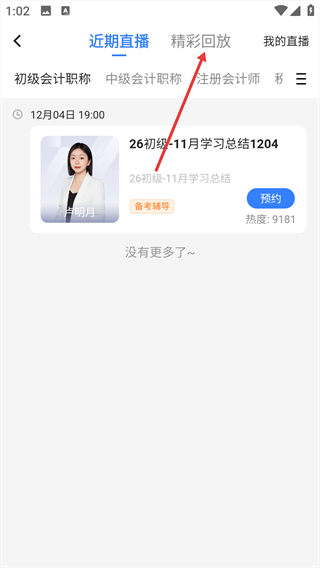 2、进入直播页面后,点击顶部的“精彩回放”标签,切换至直播回放列表。