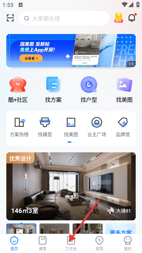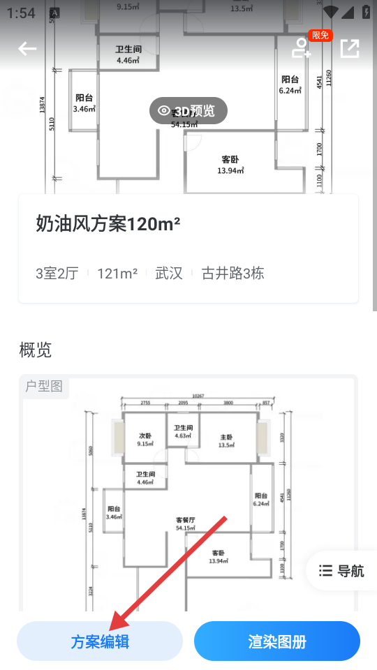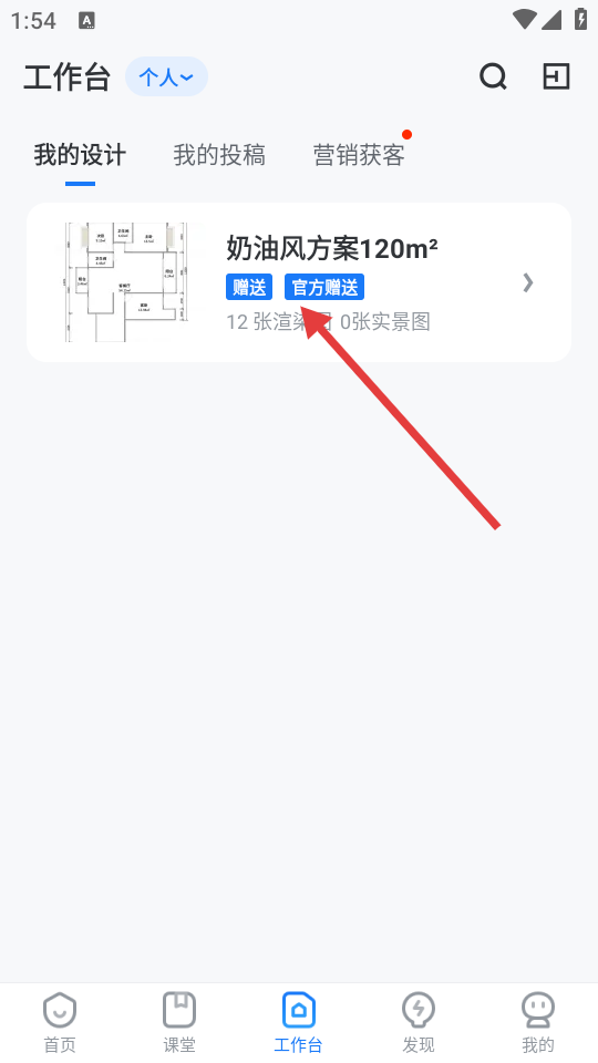 2、在工作台页面点击【奶油风方案120m²】设计方案,进入方案详情页面。