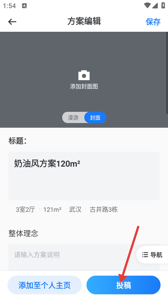 4、在方案编辑页面可编辑方案信息,完成后点击【投稿】按钮,提交方案投稿。