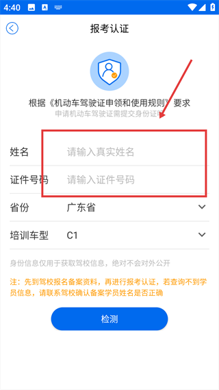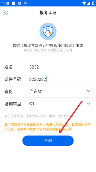 4、信息填写完成后,点击“检测”按钮,完成报考认证流程。