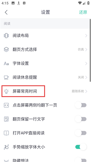 3、在【设置】页中,找到【屏幕常亮时间】选项,点击进入对应的设置弹窗。