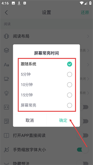 4、在【屏幕常亮时间】弹窗里,选择目标时长选项后,点击【确定】按钮完成设置。