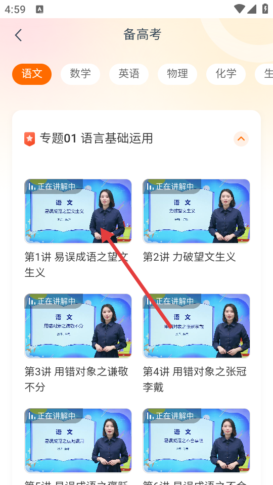 3、在备考课页面,选择【语文】学科的备高考专题,点击目标课程,进入课程播放页面。