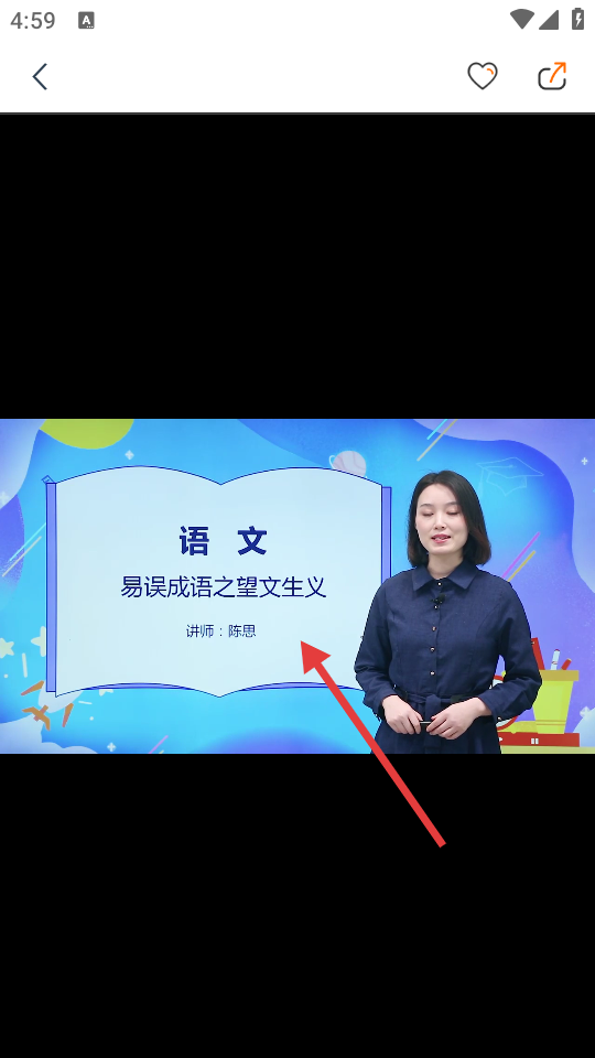 4、在课程播放页面,可观看由陈思讲师主讲的《语文-易误成语之望文生义》课程内容,也可进行收藏、分享等操作。