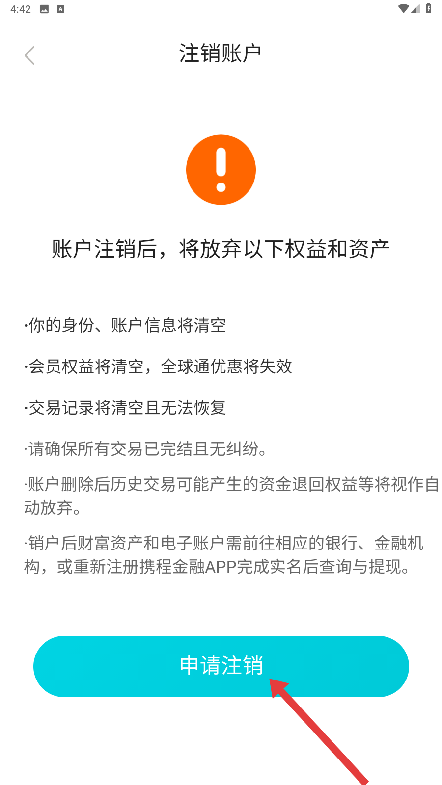 4、在注销账户页面,仔细阅读权益说明后,点击【申请注销】,就能发起账号注销的操作啦。