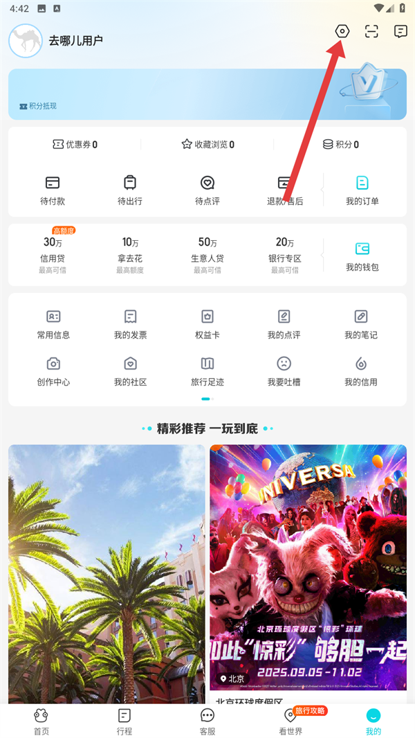 1、我们打开去哪儿旅行APP,进入【我的】页面,点击右上角设置图标。