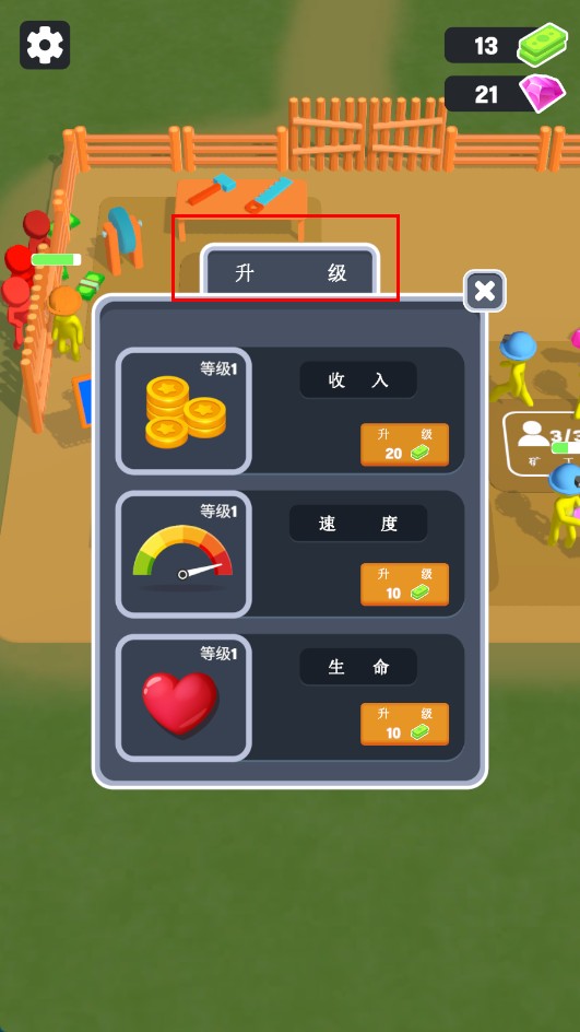 4、点击【升级】按钮,进入升级界面,用资源提升角色的收入、速度、生命等属性。