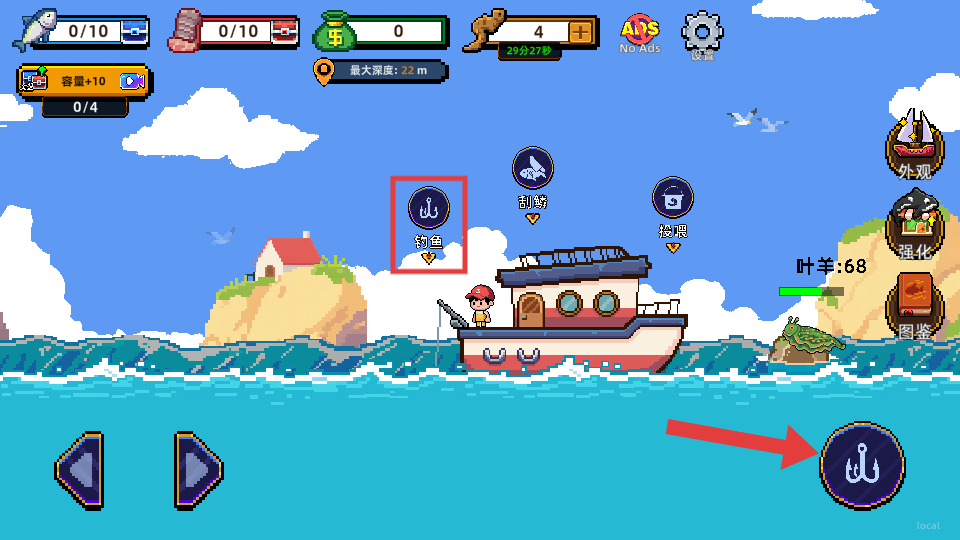 1、观察游戏主界面上方【鱼-0/10】等资源进度,点击标有【钓鱼】的按钮开启钓鱼。