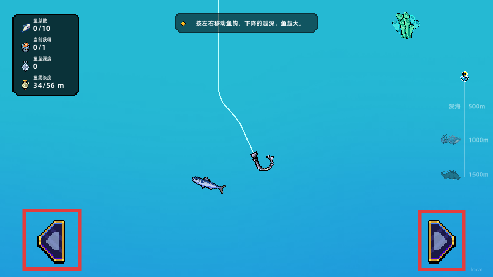2、进入钓鱼界面后,通过屏幕下方【左右箭头按钮】操控鱼钩移动,依据提示让鱼钩下沉以钓更大的鱼。