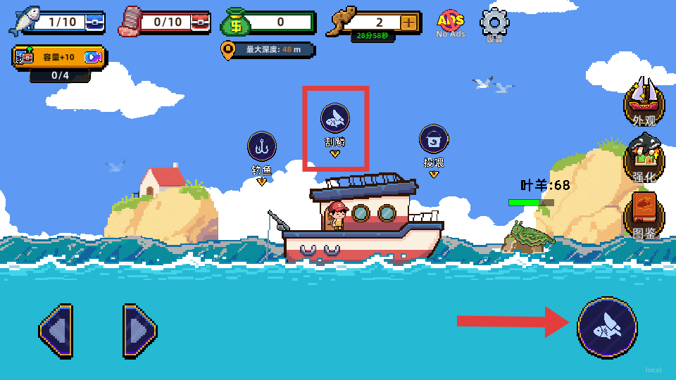 3、升级系统设计合理,赚到的金币可以用来强化装备,提升钓鱼效率和处理速度,看着小船一点点变豪华特别有成就感。