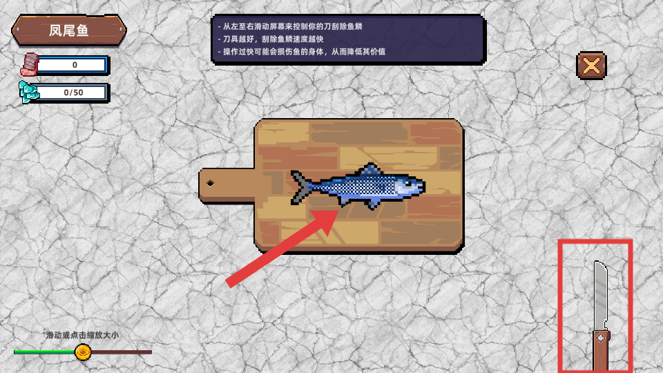 4、在刮鳞界面,按照提示从左至右滑动屏幕,使用右侧【刀具】为案板上的【凤尾鱼】刮鳞,注意控制速度防止伤鱼。