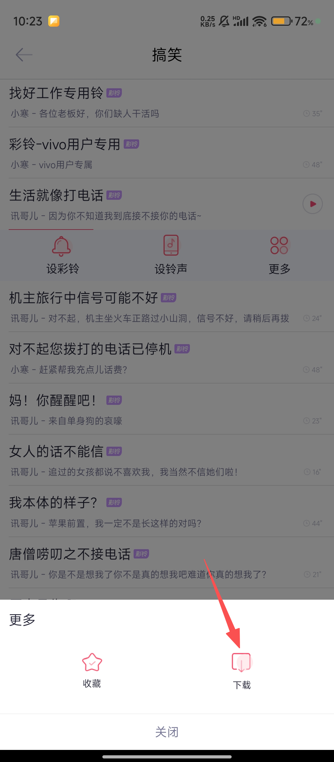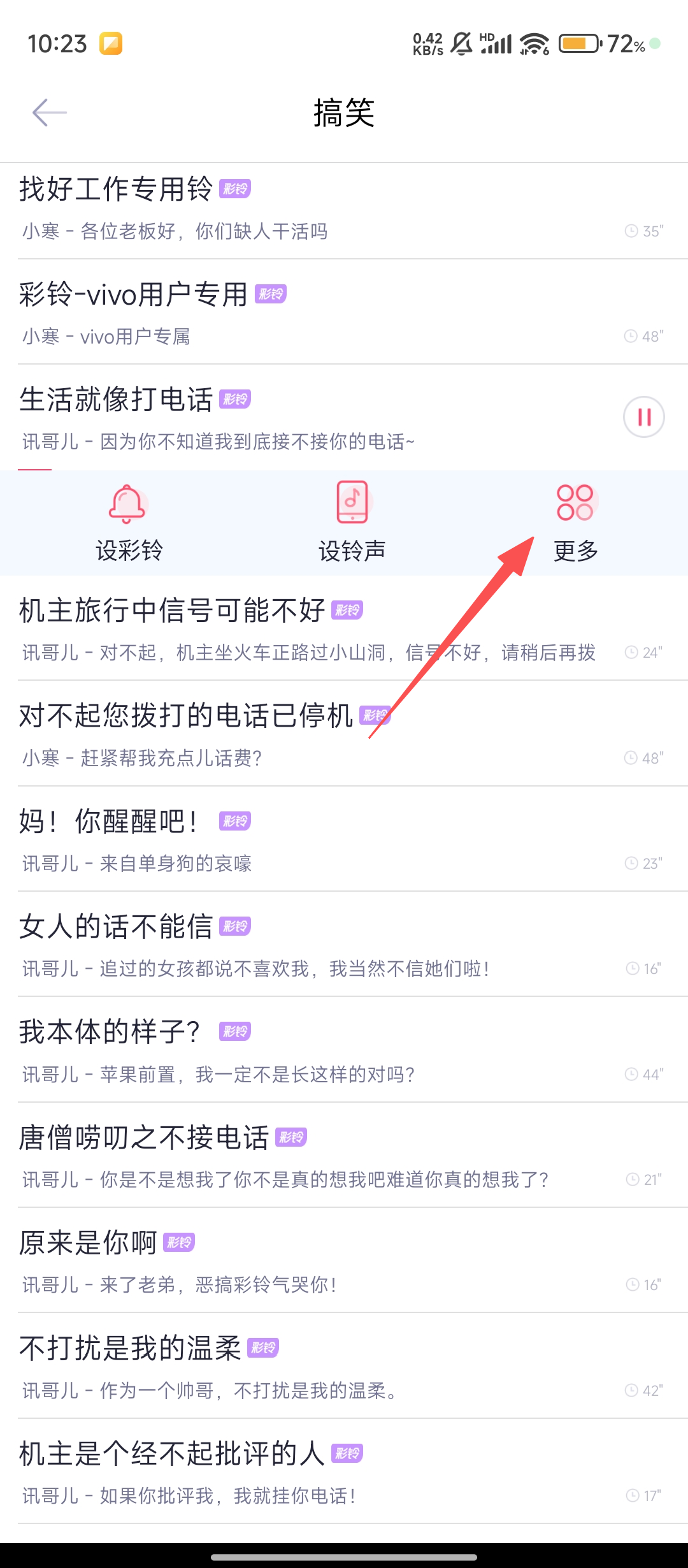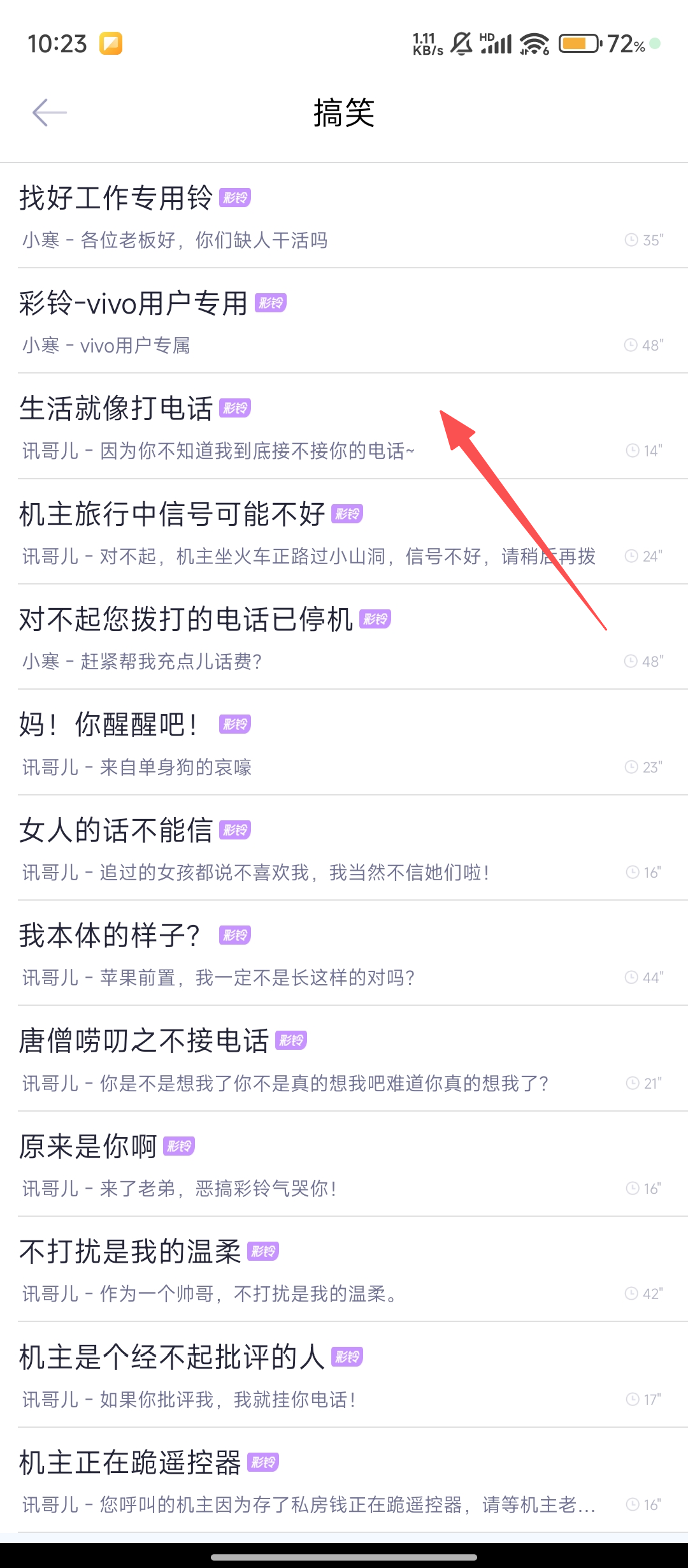 2、在搞笑铃声列表里,找到心仪的铃声并点击,进入该铃声的操作界面哦。