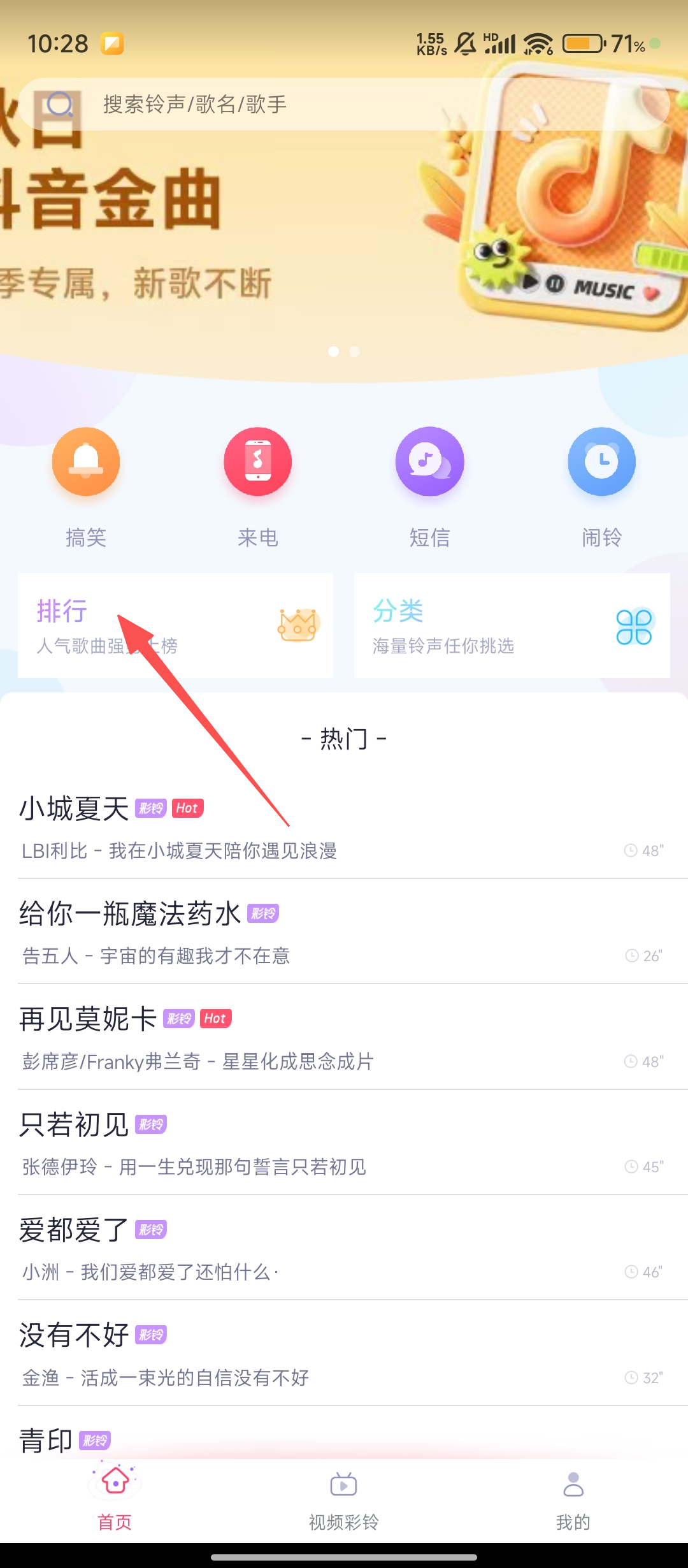 1、在【酷音铃声】首页,点击【排行】入口,进入排行榜页面,为收藏歌曲做好准备啦。