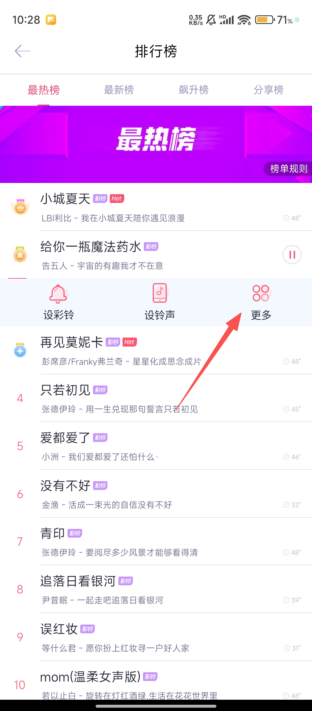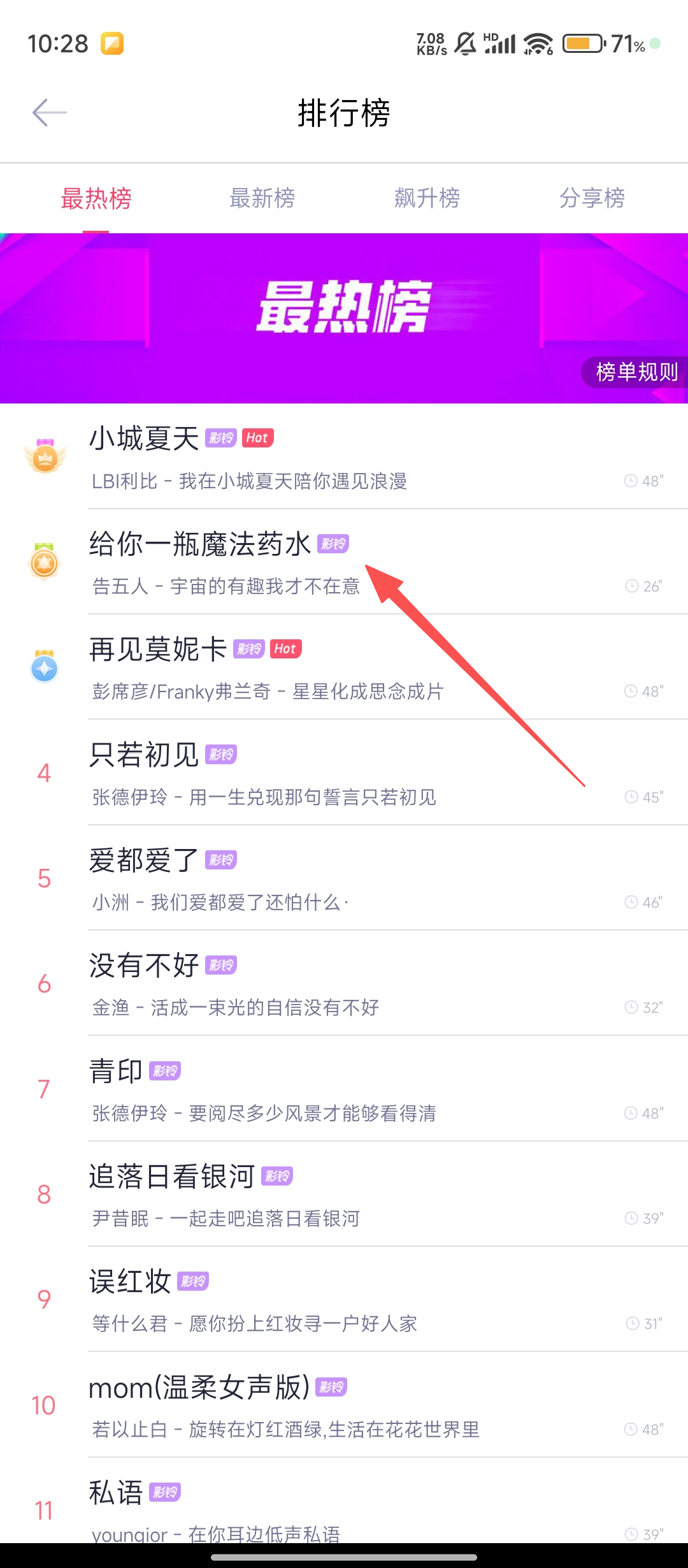 2、在排行榜页面,选中你喜欢的歌曲,进入歌曲操作界面,继续向收藏迈进哦。