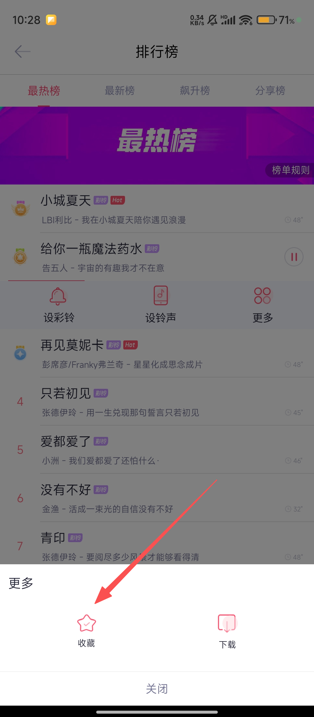 3、在歌曲操作界面,点击【更多】按钮,弹出操作选项列表,收藏选项即刻呈现呢。