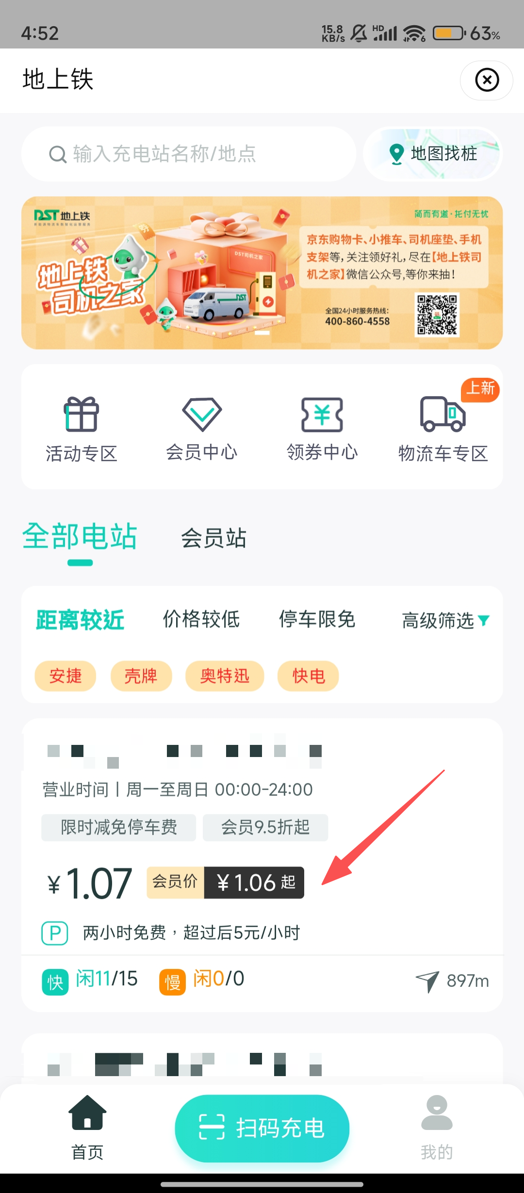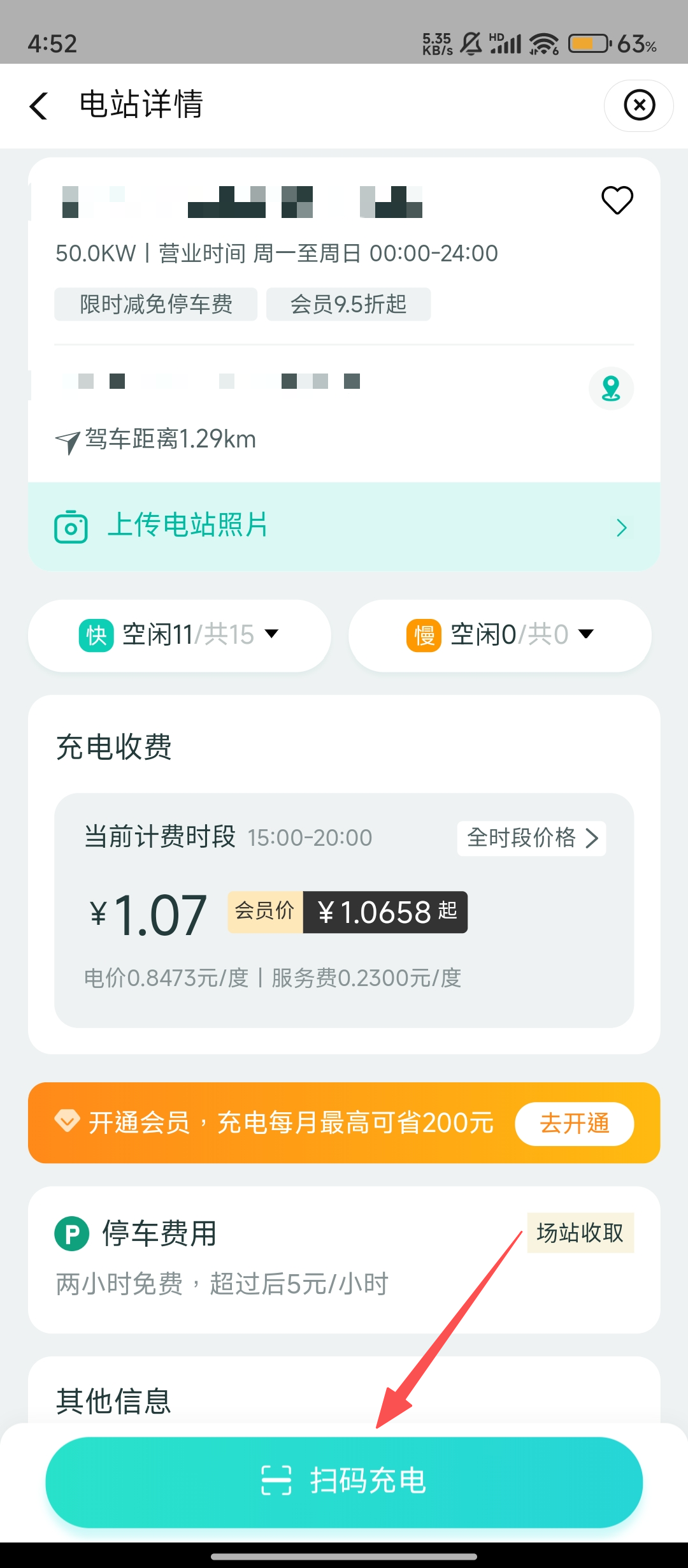 3、进入【电站详情】后,点击底部【扫码充电】按钮,开启充电流程啦。