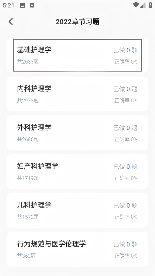 2、在“2022章节习题”列表中,点击【基础护理学】,进入基础护理学的章节列表页。