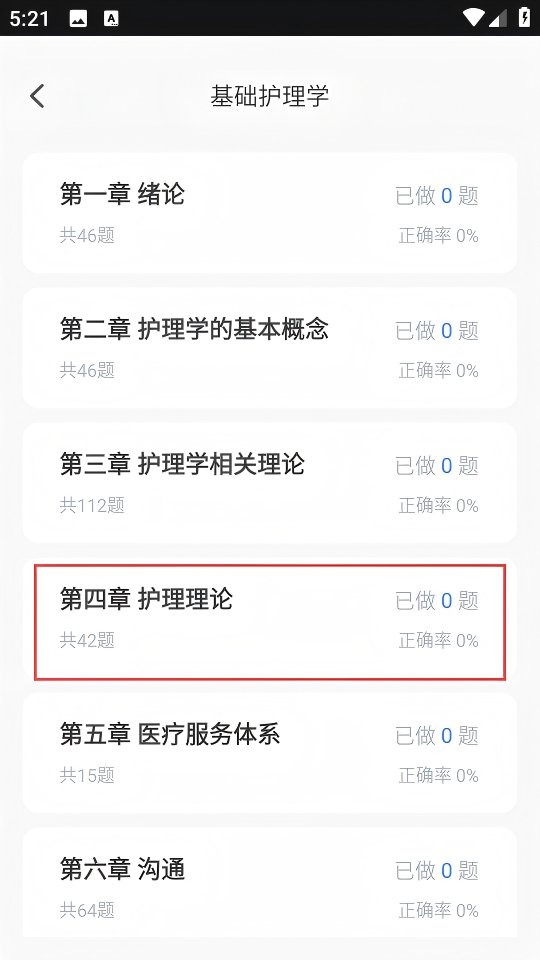 3、在基础护理学章节列表里,选择【第四章-护理理论】,进入该章节的题目列表页。