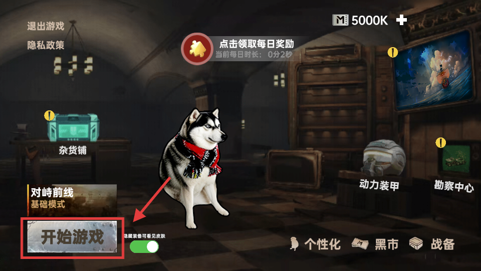 1、点击【开始游戏】进入【对峙前线-基础模式】,可先领每日奖励或逛【杂货铺】筹备物资。