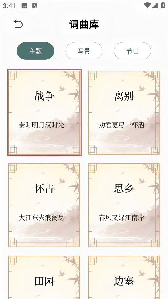 2、在主题分类页面,选择【战争】主题,进入战争类诗词列表页面。