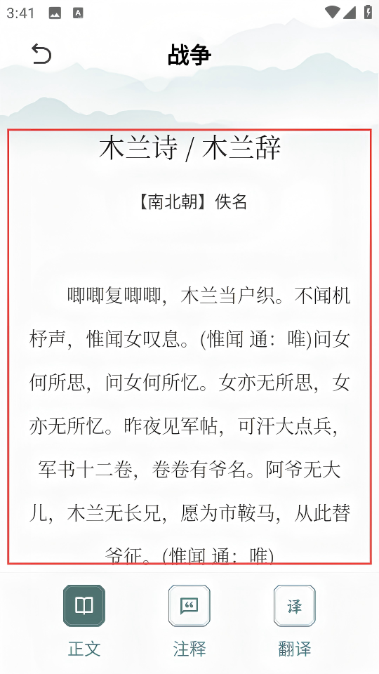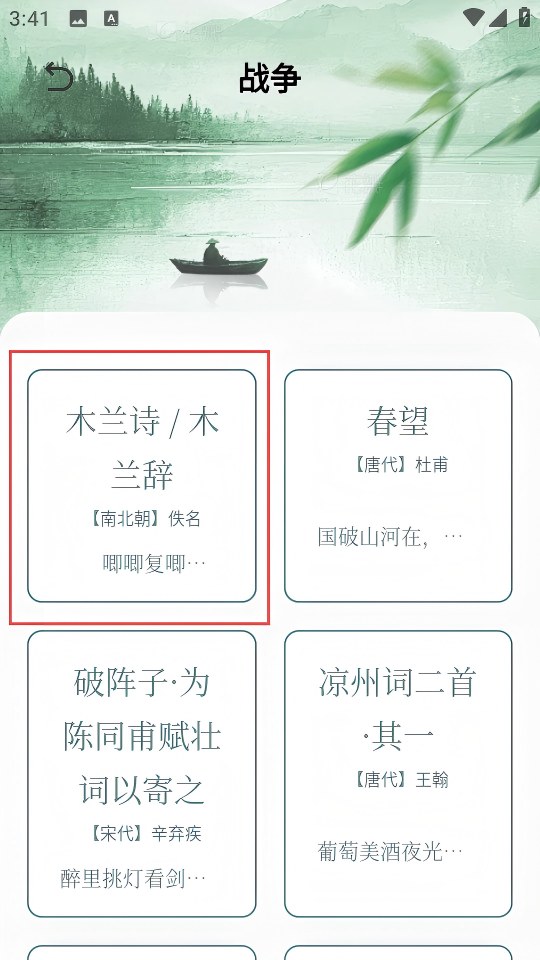 3、在战争类诗词列表中,选择《木兰诗/木兰辞》,进入该诗词详情页面。
