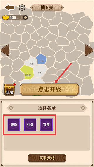 1、在【第5关】界面选择【曹操】【刘备】等英雄后,点击【点击开战】按钮进入对局。