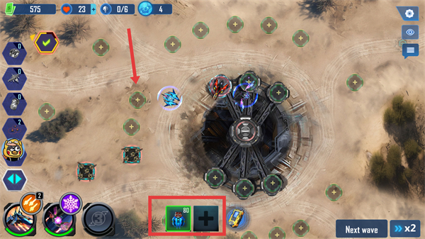 2、在关卡中选择【Rocket】等防御塔,放置在地图的绿色加号点位上,构建防御阵线。