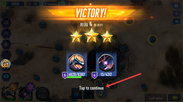 4、关卡胜利后,点击【Tap-to-continue】,领取奖励并继续挑战后续关卡。