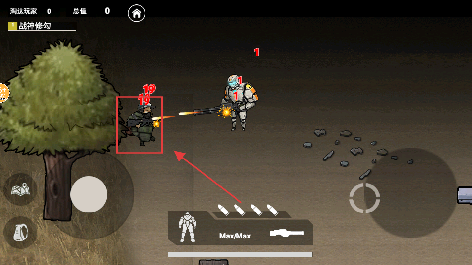 2、战斗时躲在树后瞄准敌人射击,注意弹药栏,淘汰敌人提升【淘汰玩家】计数,积累【总值】获取更多资源。
