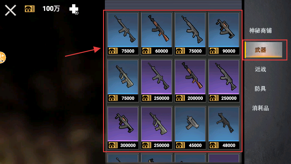 4、进入神秘商铺【武器】栏,用【100万】货币购买高性价比武器,如【60000】的AK,提升火力助力突围。