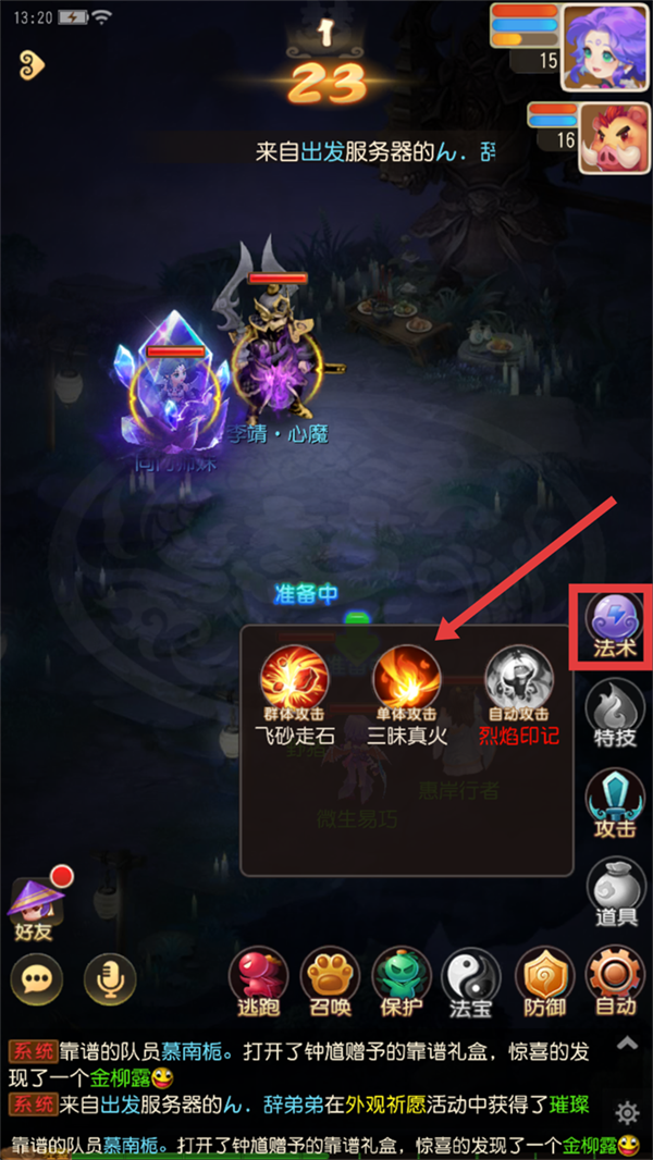 2、进入战斗后,点击右侧【法术】栏,根据战况选择【三昧真火】这类单体攻击技能,对目标造成高额伤害哦。