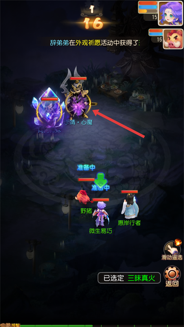 3、选定【三昧真火】后,瞄准【李靖-心魔】释放,可精准打击,助力我们快速破敌呀。