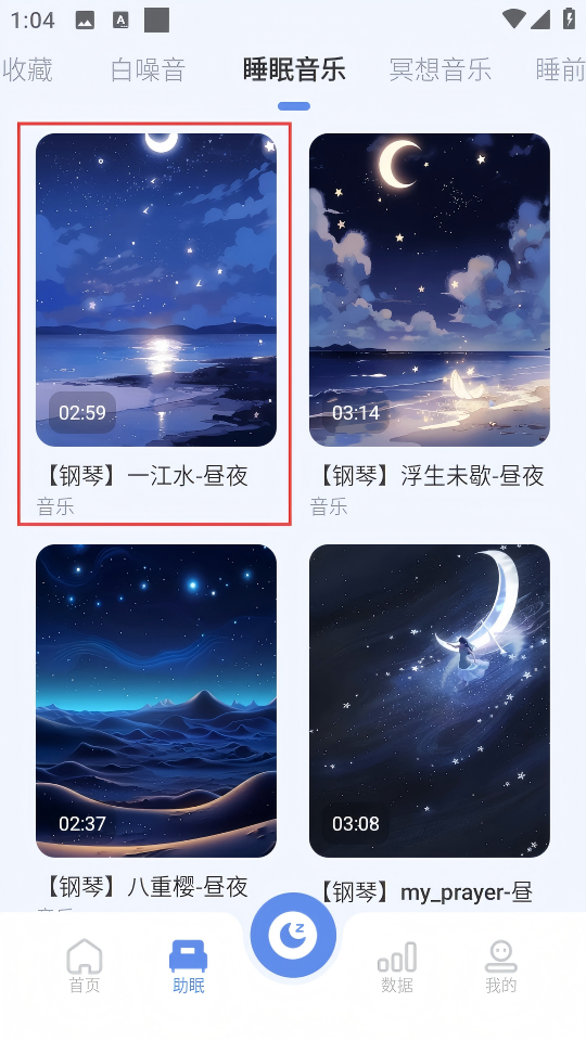 3、在助眠页面的睡眠音乐分类中选择【【钢琴】-江水-昼夜】,进入该音乐播放页面。