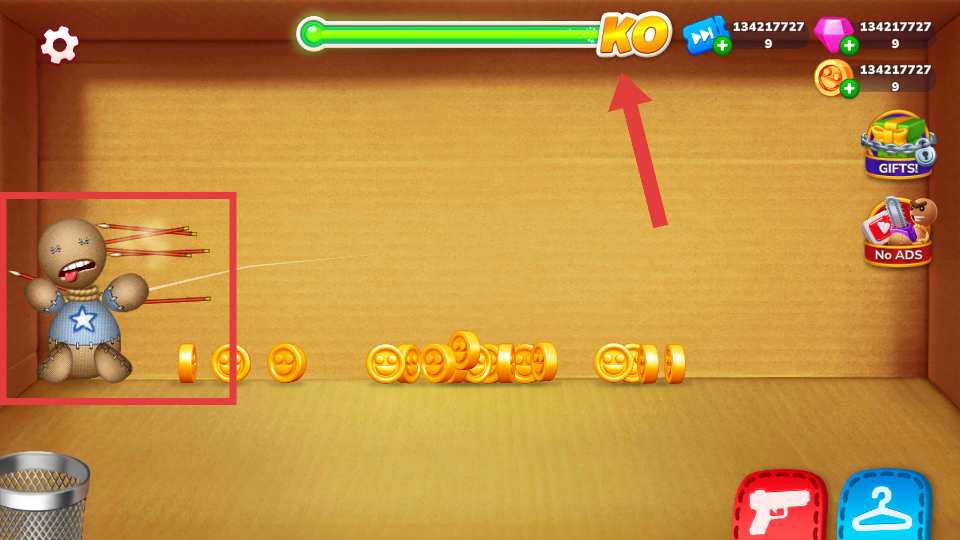 4、持续攻击木偶人,直至上方出现【KO】标识,即可获得金币奖励并通关。