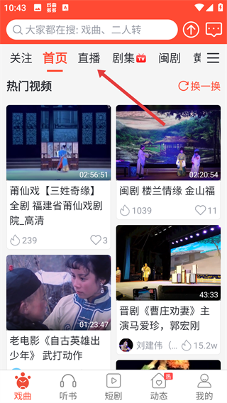 1、打开软件进入首页之后,可以看到这里有很多的戏曲和音乐资源,点击就能观看。